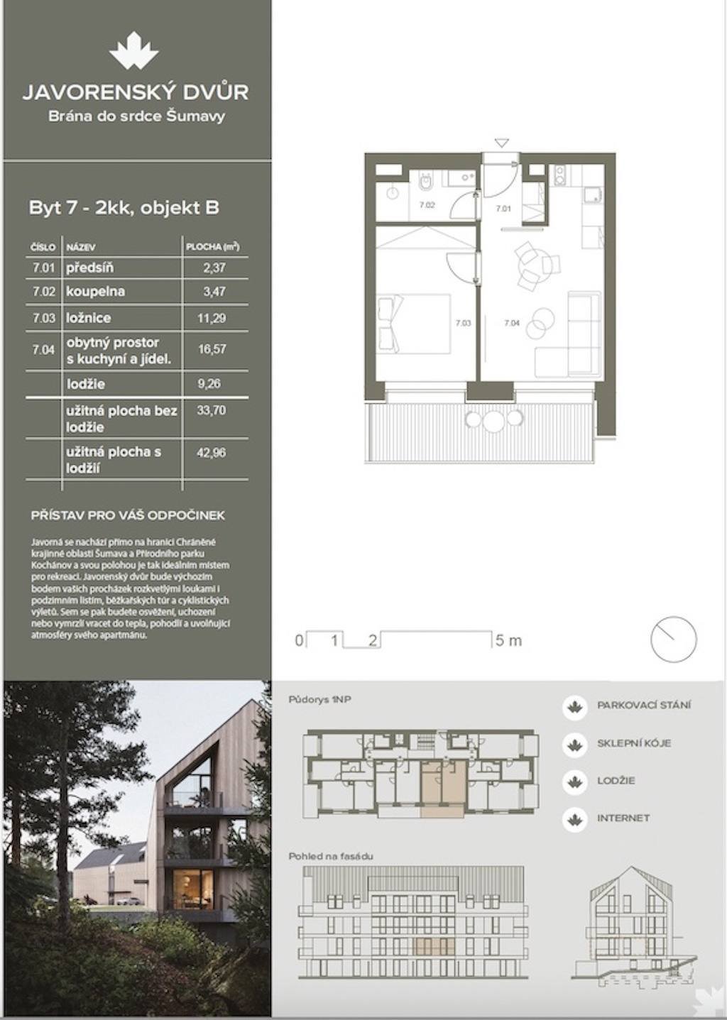 Celková plocha apartmánu je 35 m². Patří k němu prostorná lodžie o velikosti 9,26 m² s nádherným výhledem do okolní přírody. V ceně je i sklepní kóje (2,2 m²) a venkovní parkovací stání.